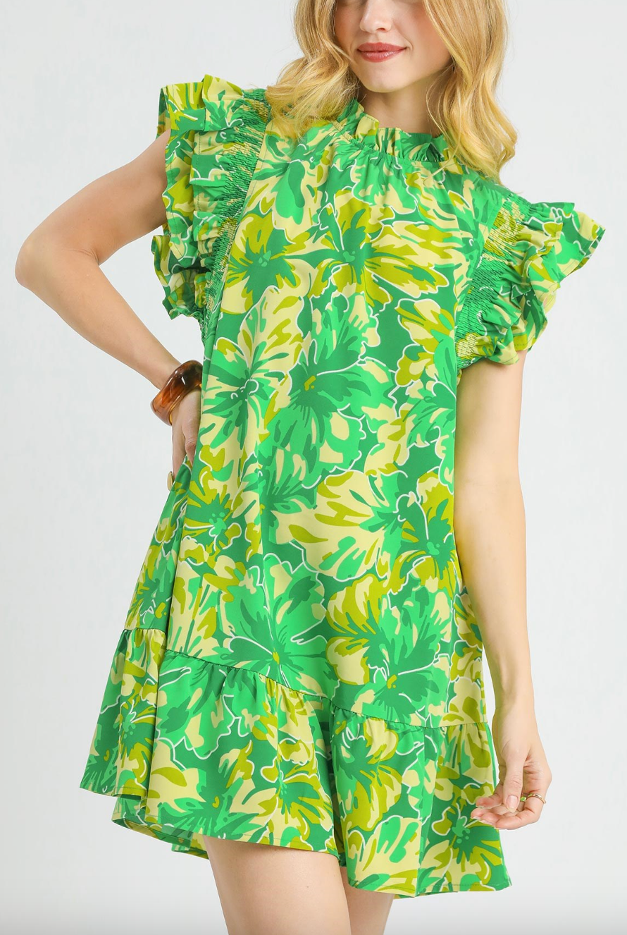 1510 Yellow & Green Print Ruffle Sleeve Dress